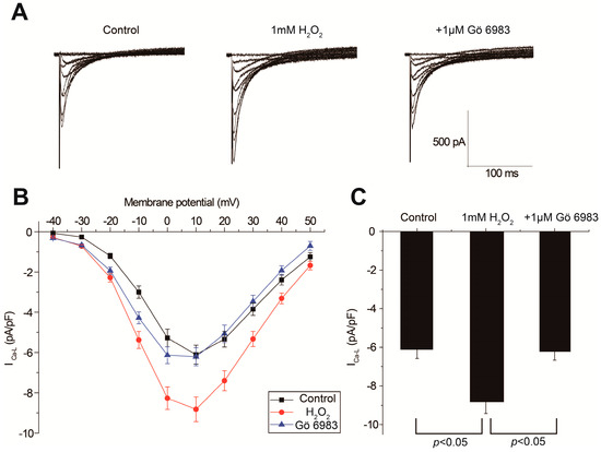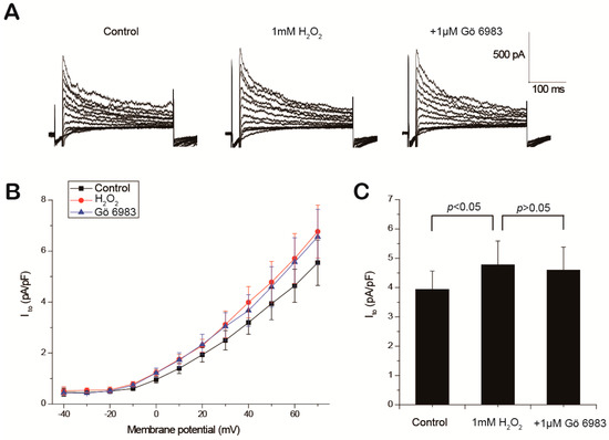 The effects of H2O2 and the PKC inhibitor on the major membrane currents were analyzed using a voltage clamp. The representative current-voltage traces of ICa,L are displayed in Figure 4A, and the averaged I–V curves (n = 5) are shown in Figure 4B. Our results show that 1 mM H2O2 significantly enhanced ICa,L, which was effectively attenuated by Gö 6983. The peak amplitudes of ICa,L at +10 mV were measured for data analysis. As shown in Figure 4C, ICa,L was elevated from −6.11 ± 0.47 to −8.82 ± 0.61 pA/pF after H2O2 perfusion (p < 0.01, control vs. H2O2, n = 5), and decreased to −6.21 ± 0.45 pA/pF after the addition of Gö 6983 (p < 0.01, H2O2 vs. Gö 6983, n = 5). In the control experiments, the run-down of ICa,L was less than 5% [19].