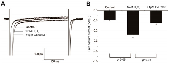 INa,L plays a key role in H2O2-induced afterdepolarizations [19,20,21]. INa,L curves averaged by five replicated depolarizing voltage steps from −120 to −30 mV of one representative cell are shown in Figure 5A. The amplitudes of INa,L were measured at 200 ms and are summarized in Figure 5B. Results showed that INa,L was elevated from −0.09 ± 0.01 to −0.23 ± 0.02 pA/pF (p < 0.01, control vs. H2O2, n = 7) and attenuated by 1 μM Gö 6983 to −0.11 ± 0.02 pA/pF (p < 0.01, H2O2 vs. Gö 6983, n = 7).