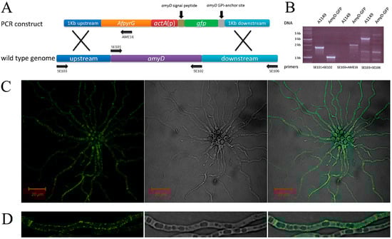 For generation of a strain expressing an chimera-AmyD-GFP strain, a construct containing all following elements: 1 kb upstream of amyD, AfpyrG, actA(p), amyD signal peptide sequence, gfp (no stop codon) and amyD GPI-anchor site sequence, and 1 kb downstream of amyD, was generated and transformed to A1149 protoplasts. For details of strain construction and verification see Figure 2A,B.