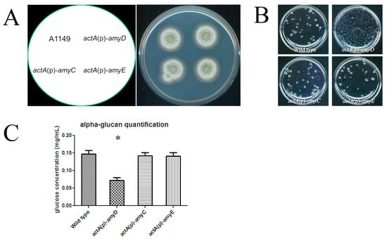 We overexpressed amyC and amyE to examine their effects on α‑glucan. An actin promoter (actA(p)) from A. nidulans was used to overexpress these genes as we previously used for amyD []. The actA(p)-amyC and actA(p)-amyE strains had no obvious phenotypic change compared to the wild-type reference strain A1149, when tested on solid medium, or when grown in shaken liquid medium with respect to the colony size (Figure 2A,B). In contrast, the actA(p)-amyD strain formed many tiny colonies in shaken liquid culture (Figure 2B). This suggests that AmyC and AmyE may not have the same function as AmyD. Our qPCR results showed amyC and amyE were each overexpressed by several hundred-fold when regulated by actA(p), confirming their low expression under native promoters (Table 1). However, the α-glucan content in actA(p)-amyC and actA(p)-amyE was comparable to the wild-type cells (Figure 2C), unlike actA(p)-amyD (Figure 2C). So far, AmyD is the only reported amylase-like protein that has a repressive effect on α‑glucan accumulation in A. nidulans.