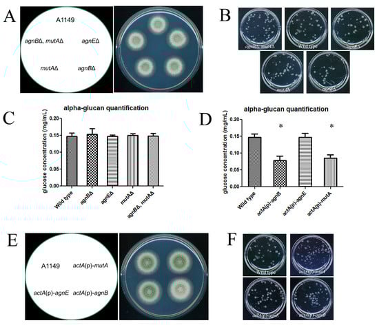 On the other hand, amyD had a relatively high expression level during A. nidulans asexual development []. It is still possible the function of α-glucanase depends on AmyD. However, when amyD was deleted from actA(p)-agnB and actA(p)-mutA, the repressive effects on α-glucan from AgnB and MutA were maintained (Figure 4C). Therefore, the functions of glucanases are independent from AmyD. Evidence from other α-glucanase characterization work also showed that α-glucanase is functional by itself [,,]. In addition, we noticed that, when AgnB or MutA was overexpressed in an AmyDΔ background, the effect from AmyD deletion was abolished (compare data in [] with Figure 3D and Figure 4C). Thus, we interpret this as α-glucanases being superior in regulating α-glucan content in the cell wall.