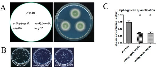 In our previous work, we found that α-glucan content was correlated with sensitivity to Calcofluor White (CFW) []. We wondered if this change was also correlated with α-glucan accumulation dynamics. We tested all strains on 50 μg/mL CFW. Only actA(p)-amyD showed delayed germination and/or slower growth, whereas all other strains maintained the same growth ability (Figure 5B).
