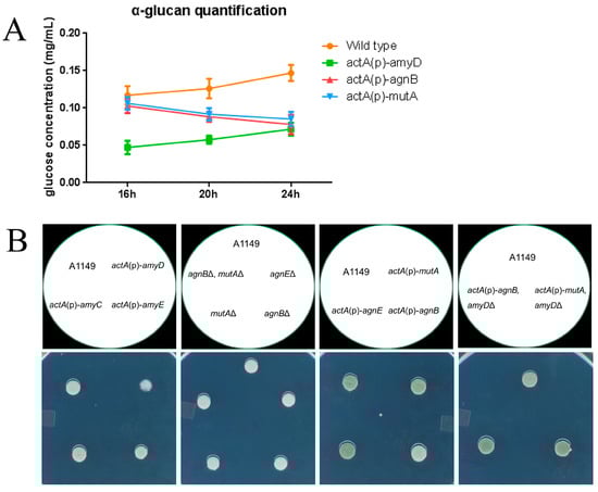 Dynamics of α-glucan accumulation and its impact on CFW sensitivity. (A) Dynamics of α-glucan accumulation in each strain with time. 2 × 107 spores of each strain were inoculated in 100 mL complete medium. Samples were grown in flasks at 30 °C with 150 rpm for 16 h, 20 h, and 24 h, respectively. α-glucan was extracted from 1 mg of dry cell wall, and then digested to glucose and quantified by an anthrone assay. Wild-type and actA(p)-amyD showed the same increasing trend from 16 h to 24 h, except the glucose concentration in actA(p)-amyD was much lower than that of the wild-type at each time point. The actA(p)-agnB and actA(p)-mutA had the same decreasing trend from 16 h to 24 h; (B) freshly harvested conidia (105) of each strain were inoculated on 50 μg/mL CFW plates and the plates were incubated at 30 °C for 48 h. Only actA(p)-amyD showed delayed germination and growth.