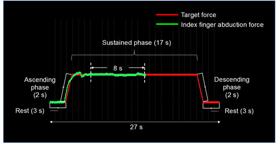 During the test, participants viewed a red trapezoidal template displayed on the monitor with a target plateau set at 60% of their own MVC. Participants were instructed to accurately trace the template by adjusting the amount of force generated by abducting their index finger (Figure 1B). Participants’ finger force was displayed as a light green line on the monitor that moved from left to right over time, upward with increased force, and downward with decreased force. Participants adjusted their finger force to keep the light green line as close as possible to the red trapezoidal template throughout the trial. Each trial was 27 s in duration. The red trapezoidal template consisted of three distinct phases, including: (1) a 2-s ascending phase during which participants gradually increased their force; (2) a 17-s sustained phase during which participants attempted to maintain a constant level of force; and (3) a 2-s descending phase during which participants slowly decreased their force. Two 3-s rest phases in addition to a 1 min break were administered before and after each trial to quantify baseline noise of the sEMG signal. During these rest phases, participants kept their index finger away from the load cell. Participants completed a block of three trials for each target force level, as well as practice trials at 30% MVC in order to confirm that they understood task instructions. The test consisted of 3 trials (×3 force levels) alternated with 1-min rest blocks. Total testing time including the electrode attachment, MVC testing, practice trials and task trials lasted 15–20 min.