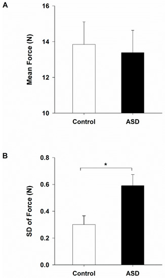 Isometric index finger abduction mean force (A); and standard deviation of force (B) in healthy controls and individuals with autism spectrum disorder (ASD). Both groups showed similar levels of mean force, although individuals with ASD showed a greater level of sustained force variability than healthy controls. * represents between group significance at the alpha level of 0.05. Error bars represent standard error.