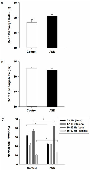 Individuals with ASD and healthy controls showed similar FDI muscle motorneuron pool mean discharge rate (F1,30 = 3.316, p = 0.079; Figure 3A) and discharge rate variability (F1,30 = 1.023, p = 0.320; Figure 3B). For normalized power of the motorneuron pool, the main effect of frequency band (F1.557,45.157 = 59.379, p = 0.000) and the interactive effect of frequency band and group (F1.557,45.157 = 5.173, p = 0.015) were significant (Figure 3C). Normalized beta power (10–35 Hz) was significantly greater than power at other frequencies, whereas gamma power (35–60 Hz) was significantly lower than other frequency bands (delta (0–4 Hz): 26.976% ± 1.945%; alpha (4–10 Hz): 21.807% ± 1.091%; beta (10–35 Hz): 39.467% ± 1.097%; gamma (35–60 Hz): 11.750% ± 0.737%). Normalized power was significantly lower in individuals with ASD compared to controls at delta band (ASD-Control = −9.787% ± 3.889% , p = 0.018), while patients showed greater normalized power than controls at beta (10–35 Hz: ASD-Control = 5.546% ± 2.194%, p = 0.017) and gamma (35–60 Hz: ASD-Control = 3.445 ± 1.474%, p = 0.027) frequencies. No differences between groups were found for alpha band power.