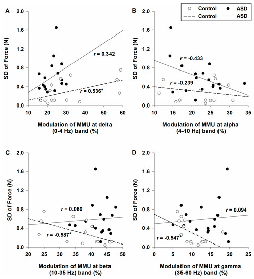 Relationships between the standard deviation of force and motorneuron pool activity of the FDI muscle at frequency bands of: delta, 0–4 Hz (A); alpha, 4–10 Hz (B); beta, 10–35 Hz (C); and gamma, 35–60 Hz (D). Behavioral–neuromuscular correlations were observed not significant for individuals with ASD at any frequency bands. Increased force variability was significantly associated with increased modulation of the motorneuron pool firing at 0–4 Hz in healthy controls. Force variability reduction was also significantly associated with increased modulation of motor units at beta (10–35 Hz) and gamma (35–60 Hz) frequency bands in healthy participants. * represents p value less than 0.05 and the absolute value of the correlation coefficient (|r|) greater than 0.5.