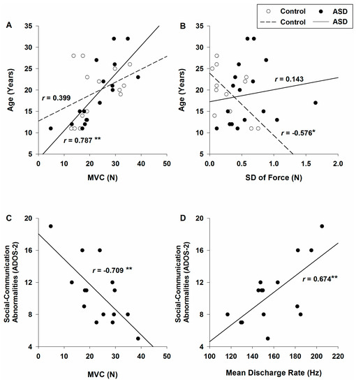 Relationships between age and isometric index finger abduction maximum voluntary contraction (MVC) (A) and standard deviation of force (B) for both groups. Relationships between clinical ratings of social-communication abnormalities on Autism diagnostic observation schedule-2 (ADOS-)2 and measures of MVC (C) and mean discharge rate of motorneuron pool activity (D) in individuals with ASD. * represents p value less than 0.05, ** represents p-value less than 0.01 and the absolute value of the correlation coefficient (|r|) greater than 0.5.