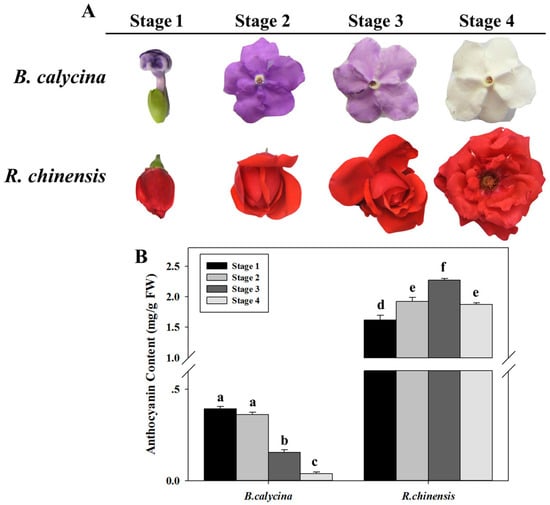 Change in the colour and anthocyanin contents during flower development of Brunfelsia calycina (Hook.) Benth. and Rosa chinensis Jacq. (A) The images of the flowers of two species. Stage 1 to 4 indicates flower buds, dark purple, light purple and white flowers respectively for B. calycina. For R. chinensis, the relevant stages represent flower buds, partially open, fully open and initially senescent flowers; (B) Change in anthocyanin content per gram fresh petals of B. calycina and R. chinensis flowers during the development. The values are means of the measurements of three individual extractions. Error bars indicate the standard error of mean (SEM) of the values. Different letters denote significant differences in the values according to unpaired t test (p < 0.05) while shared letters denote non-significant differences in the values.