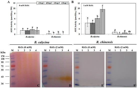 The above ADE activity patterns obtained by the spectrophotometry method were further confirmed by the in-gel activity assays using the same anthocyanin substrates described above, with or without H2O2 (Figure 2C–F). The same amount of protein was loaded for each sample (Figure S1). Correlated to the above patterns (Figure 2A,B), weak H2O2 non-dependent ADE activity signals were observed for the B. calycina (Figure 2C). More intensive activity staining was observed in the presence of 2 mM H2O2 for B. calycina, particularly for the samples at the stages when the petals were turning white (Figure 2D). No activity staining was seen for any of the samples of R. chinensis flower with or without H2O2 (Figure 2E,F). Taken together, high H2O2-dependent ADE activity was detected to be positively correlated to anthocyanin degradation during B. calycina flower development, and minimal ADE activities in R. chinensis were correlated to minimal anthocyanin degradation during the same process of flower development.
