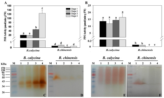 The activities of POD and PPO in the petals were also determined using both spectrophotometry (Figure 3A,B) and the in-gel activity assay (Figure 3C–F). In B. calycina flowers, POD activities of close to 20 μmol/min/g FW were detected at stage 1 and 2, while 2.3- and 6.2-fold higher activities were detected respectively at pale purple and white stage, stages 3 and 4 (Figure 3A,C). Interestingly, the main POD activity staining, at close to 40 kDa (Figure 3C), was of the same intensity as the H2O2-dependent ADE activity staining (Figure 2D). Based on the requirement of H2O2 for POD activities, the H2O2-dependent ADE activity might be due to the activities of PODs. The PPO activities were detected using 4-methy catechol as the substrates, and were found to be almost the same intensity in all stages of B. calycina flowers, with slightly higher activities, around 16 μmol/min/g FW, at stage 4 (Figure 3B). Weak in-gel PPO activity bands were seen at stage 3 and 4, showing much less intensity than the POD activity bands (Figure 3E).