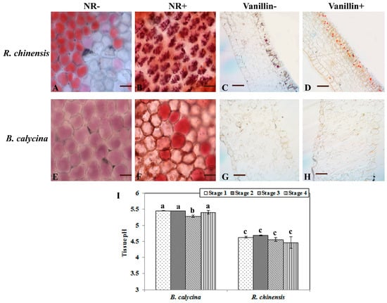 Tannin staining and pH of Brunfelsia calycina and Rosa chinensis flowers. (A,B,E,F) show the neutral red (NR) staining of the epidermal cells of B. calycina and R. chinensis petals. (A,E) are without staining (NR-), and (B,F) are with staining (NR+). Scale bars in (A,B,E,F) indicate 25 μm. (C,D,G,H) show the vanillin staining of the sections (2-mm thick) of the flower petals, (C,G) without vanillin treatment (Vanillin-), and (D,H) with vanillin treatment (Vanillin+). Scale bars in (C,D,G,H) indicate 100 μm. (I) The pH values of the homogenate of B. calycina and R. chinensis flower petals. The statistical details of the values presented in (I) are as described in Figure 1.