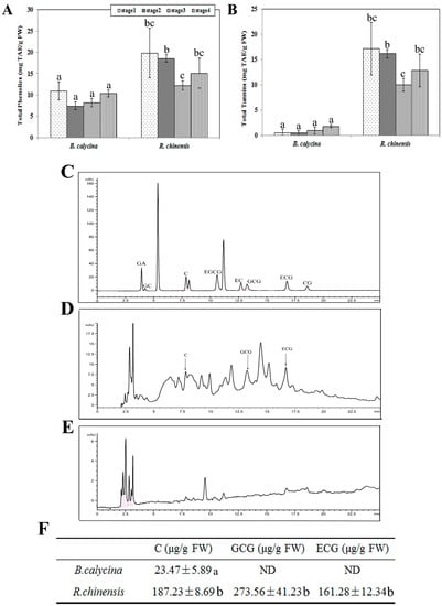 The content of five tannins components, namely, catechin and its derivates, epicatechin (EC), gallocatechin-3-gallate (GCG), epicatechin-3-gallate (ECG) and epigallocatechin-3-gallate (EGCG), were examined in the petals at stage 2 by high performance liquid chromatography (HPLC) (Figure 5C–F). Correlated to the low content of tannins in B. calycina, catechin itself was the only catechin derivate detected in those petals, at 23.47 ± 5.89 μg/g FW (Figure 5E,F). In R. chinensis petals, relatively high contents of ECG and GCG were detected as 161.28 ± 12.34 and 273.56 ± 41.23 μg/g FW, respectively (Figure 5C,D,F).