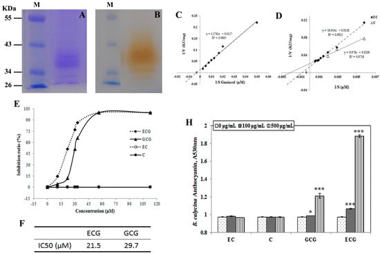 The tannin constituents in the petals that were identified by HPLC, namely C, EC, ECG and GCG were chosen to investigate their effect on the anthocyanin degradation in flowers. Due to the low anthocyanin degradation activities in R. chinensis petals, the anthocyanin degradation-related POD was purified from B. calycina by sequential diethylaminoethanol (DEAE)-sepharose and Sephadex G200 column chromatography (Figure S2). The purified POD fraction contained a major band of close to 40 kDa and the band showed activity with guaiacol (Figure 6A,B) in the presence of H2O2, indicating the POD was highly purified. The Km (the Michaelis constant) of the enzyme to guaiacol was detected as 336.7 μM at 25 °C (Figure 6C).