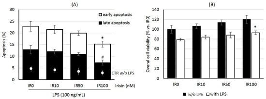 Protective effects of irisin (IR) pretreatment on lipopolysaccharide (LPS)-stimulated macrophage RAW 264.7 cells. The cells were pre-incubated with various doses of irisin (0–100 nM) for 24 h, and after that stimulated with LPS (100 ng/mL) for the next 24 h. Cells viability was tested cytometrically using an Annexin V kit (A), where the results are presented as a mean percentage of late apoptotic (solid bars) or early apoptotic cells (open bars) ± S.E. or colorimetrically in the 3-(4,5-dimethyl thiazol-2-yl)-2,5-diphenyl tetrazolium bromide (MTT) test (B), where the results are presented as a mean percentage vs. IR0 group. The line within the bars shows the general level of apoptosis measured after 24 h without LPS stimulation. N = four to five independent experiments. Statistical significances were determined with the ANOVA with Tukey post hoc analysis. * p < 0.05 significance compared with the control group for early apoptosis intensity or overall viability; # p < 0.05 significance compared with the control group for late apoptosis intensity.
