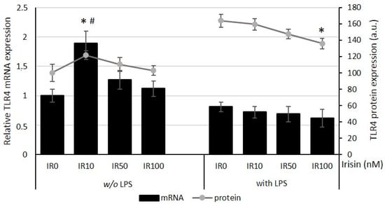 Effects of irisin pretreatment (IR; 0–100 nM) on Toll-like receptor 4 (TLR4) expression on mRNA and protein level. Macrophages RAW 264.7, pretreated with irisin for 24 h, were cultured with and without LPS (100 ng/mL) for an additional 6 h (mRNA expression; rtPCR; bars) or 24 h (protein expression; cytometer; lines). Protein level was expressed as a percentage vs. control group (0 nM) as 100%. Control groups—IR0 with or without (w/o) LPS. The results are expressed as means + SE of four to five independent experiments (# p < 0.05 significance compared with control group for mRNAs expression; * p < 0.05 significance compared with control group for protein expression). Statistical significances were determined with the ANOVA with Tukey post hoc analysis.