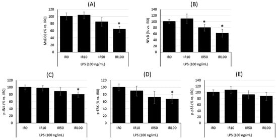 Irisin inhibits the downstream pathway of TLR4/MyD88 in macrophages activated with LPS. RAW 264.7 macrophages were cultured with various irisin concentrations (IR; 0–100 nM) for 24 h and then stimulated with LPS (100 ng/mL). The relative protein levels of MyD88 (A); nuclear factor-κB (NF-κB) (B), JNK (C), ERK (D) and p38 mitogen-activated protein kinases (MAPK) (E) were evaluated cytometrically and expressed as a percentage vs. control group (irisin 0 nM) presented as a 100%. N = four independent experiments. Statistical significances were determined with the ANOVA with Tukey post hoc analysis. * p < 0.05 significance compared with control group.