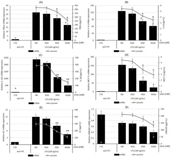 Irisin reduces pro-inflammatory cytokines expression and secretion by LPS-activated macrophages. Macrophage RAW 264.7 cells were pretreated for 24 h with irisin (IR; 0–100 nM) and then stimulated with LPS (100 ng/mL) for 4 h (mRNA expression; rtPCR) or 24 h (cytokine release; ELISA tests). Relative mRNA expression (bars) and protein secretion (lines) of tumor necrosis factor alpha (TNFα) (A), interleukin 6 (IL-6) (B), interleukin 1β (IL-1β) (C), monocyte chemotactic protein 1 (MCP-1) (D), keratinocyte chemoattractant (KC) (E), and high mobility group box 1 (HMGB1) (F) were assessed. CTR—non-stimulated group, quiescent macrophages. The results are expressed as means ± SE of four to five independent experiments (* p < 0.05 significance compared with IR0 group for mRNA expression; # p < 0.05 significance compared with IR0 group for cytokine release to supernatant). Statistical significances were determined with the ANOVA with Tukey post hoc analysis.