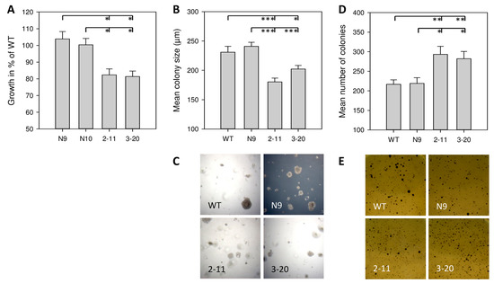 To determine anchorage-independent growth abilities, colony number and size were measured in the soft agar assay. Colonies of WT (231.1 ± 9.9 µm SEM) and N9 (240.9 ± 7.0 µm SEM) were larger than those of 2-11 (180.3 ± 6.6 µm SEM, p < 0.001) and 3-20 (202.1 ± 6.1 µm SEM, p = 0.014 vs. WT, p < 0.001 vs. N9), respectively (Figure 2B,C). Interestingly, after staining of vital colonies with MTT-solution (5 mg/well), the number of vital colonies in the screened area (4 cm2) was higher in 2-11 (293.2 ± 20.5 SEM) and 3-20 (282.3 ± 18.6 SEM) compared to WT (216.6 ± 11.4 SEM) and N9 (218.8 ± 14.8 SEM) (p < 0.05).