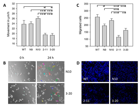 Cell movement. (A) Non-directional movement was tracked for 24 h using video time-lapse microscopy. Results are shown as the mean movement (in µm/h ± SEM) of 3 independent experiments evaluating each 40 cells; (B) Exemplary cell tracking over 24 h of single cells for N10 and 3-20 cells, 40× magnification; (C) Directional migration in the modified Boyden chamber. Results are shown as number of migrated cells after 36 h (±SEM) and are means of 3 separate experiments of triplicate determinations; (D) Representative areas of migrated cells at 10× magnification. * p < 0.025, ** p = 0.002, *** p < 0.001.