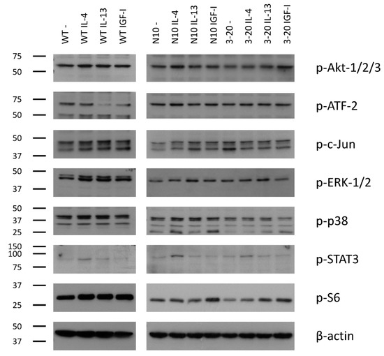 Exponentially growing cells were washed twice with ice-cold PBS (Phosphate Buffered Saline) and lysed in the indicated cell lysis buffer (buffer composition is described in the Tables S3 and S4). To analyze N-linked protein glycosylation, Capan-1 cells were incubated in the presence or absence of tunicamycin (10 µg/mL) for 24 h before preparation of lysates. To analyze associated signaling pathways, cells were seeded at the same density. After 24 h they were serum starved with a medium containing 1.5% FCS for 24 h. Afterwards cells were stimulated with IL-4, IL-13, and IGF-I (5 nM) for 5 min or left untreated as negative control before preparing lysates. Cell lysates were subjected to SDS-PAGE (sodium dodecyl sulfate polyacrylamide gel electrophoresis) and electro-transferred to PVDF (polyvinylidene fluoride) membranes. After blocking, the membranes were blotted with the respective antibodies and the corresponding secondary horseradish-conjugated antibody. Bound antibodies were visualized using enhanced chemiluminescence. To confirm equal loading, membranes were re-blotted with an anti-β-actin antibody. Quantitative analysis was performed with ImageJ v1.47.