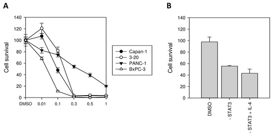 Effect of STAT3 inhibition on pancreatic cancer cell survival. Significant inhibition was achieved at 0.1 µM in different cell lines ((A), Note: For reasons of displayability, the shown scale in µM is not linear). Exogenous IL-4 was not able to antagonize the effects of STAT3 inhibition, LLL12 alone (0.3 µM) and STAT3 inhibitor in combination with IL-4 (5 nM) showed no differences in cell survival of PANC-1 wildtype cells (B). Data are shown as means of two independent experiments of quadruplicate determinations.