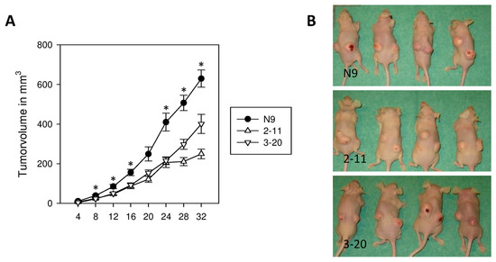 Tumor growth in a subcutaneous xenograft model. (A) Cells of N9, 2-11, and 3-20 were subcutaneously injected into nude mice. Tumor growth was measured every 4 days and tumor volume was calculated as V = length × height × width × ½. Mice were euthanized after 32 days. * p < 0.05 (N9, 2-11, 3-20; n = 16); (B) Examples of tumor formation.
