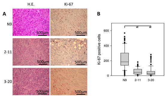 Subcutaneous tumors were removed, formalin-fixed and paraffin-embedded. 1 µm sections were prepared from the largest diameters of each tumor followed by H&E staining or immunohistochemical analysis. Immunohistochemistry was performed as described previously [41]. Monoclonal anti-Ki-67 (Abcam ab92742, 1:500, Cambridge, UK) was used as first antibody, followed by incubation with anti-rabbit immunoglobulins conjugated to peroxidase-labeled dextran polymers (N-histofine H; Nichirei Corporation, Tokyo, Japan). Staining was performed with 3-amino-9-ethylcarbazol (AEC; DAKO, Glostrup, Denmark) and counterstained with haematoxylin. Analysis of Ki-67 staining was carried out in a representative peripheral area of each tumor without necrosis using high-power field microscopy.