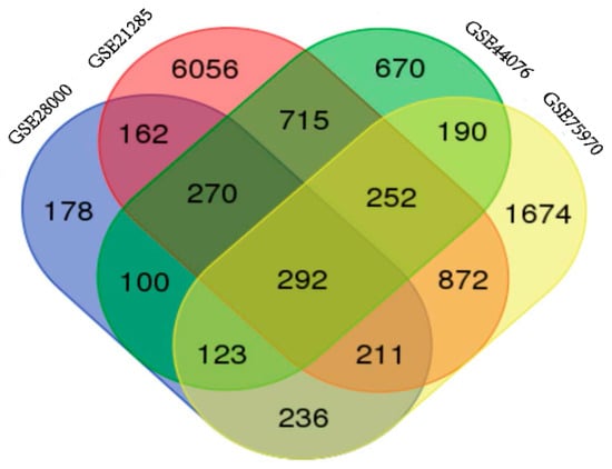Identification of 292 commonly changes DEGs from the four cohort profile data sets (GSE28000, GSE21815, GSE44076 and GSE75970) using Morpheus Website (Available online: https://software.broadinstitute.org).Different color areas represented different datasets. The cross areas meant the commonly changed DEGs. DEGs were identified with classical t-test, statistically significant DEGs were defined with p < 0.05 and [logFC] > 1 as the cut-off criterion.