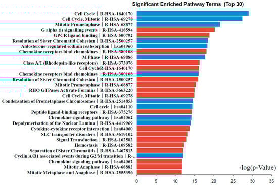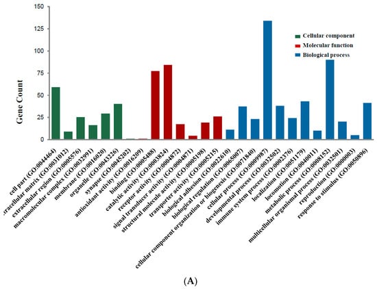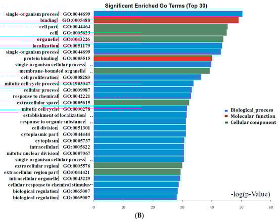 Candidate DEGs functions and pathways enrichment were analyzed using multiple online databases, including DAVID, KEGG PATHWAY (Available online: http://www.genome.jp/kegg), Reactome (Available online: http://www.reactome.org), BioCyc (Available online: http://biocyc.org), Panther (Available online: http://www.pantherdb.org) [], NHGRI and Gene Ontology website with p < 0.05 as the cut-off criterion [,,]. DEGs gene ontology analysis (GO) were performed with DAVID, Panther. The DEGs were classified into three functional groups: molecular function group, biological process group, and cellular component group (Figure 2A). As shown in Figure 2B and Table 2, in the biological process group, up-regulated genes mainly enriched in single-organism process, single-organism cellular process, cell proliferation process and mitotic cell cycle process, and the down-regulated genes mainly enriched in localization, single-organism process, single-organism cellular process, mitotic cell cycle process. In the molecular function group, up-regulated genes mainly enriched in binding, receptor binding, protein binding, and the down-regulated genes mainly enriched in binding, protein binding. In the cellular component group, up-regulated genes mainly enriched in extracellular space, extracellular region, and the down-regulated genes mainly enriched in cell part, membrane-bounded organelle, organelle. These results showed that most of the DEGs were significantly enriched in single-organism, binding, cell part and mitotic cell cycle.