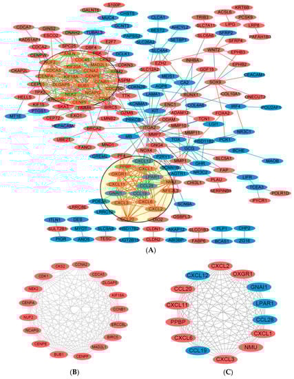 DEGs protein–protein interaction (PIP) network complex and modular analysis. (A) Using the STRING online database, total of 180 DEGs (113 up-regulated in Orange standing for upregulationand 67 down-regulated genes in Blue standing for downregulation) were filtered into the DEGs PPI network complex. The two highlighted circle areas were most significant modules; (B) Module 1 consists of 17 nodes and 109 edges, which are mainly associated with cell cycle process, sister chromatid and segregation; (C) Module 2 consists of 14 nodes and 91 edges, which are mainly associated with chemokine signaling pathway, Gα (i) signaling events, and GPCR ligand binding pathway.