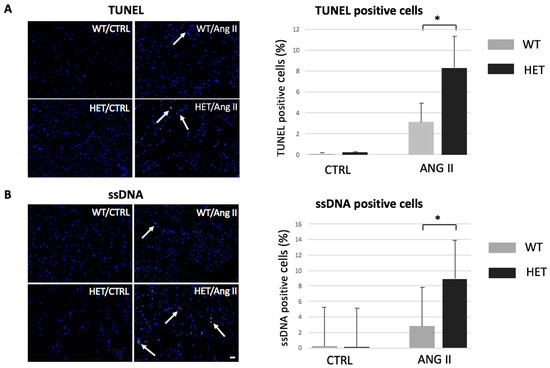 Under baseline conditions, apoptosis levels in wildtype (WT) and heterozygous (HET) animals were extremely low and barely detectable. Ang II infusion for 14 days at pharmacological doses (14 mg/kg/day) resulted in increased apoptosis in both groups, WT and HET mice. However, the HET animals exhibited significantly more TUNEL-positive cardiomyocytes compared to the WT mice (8.26% ± 3.6% vs. 3.18% ± 1.8%, p < 0.05, Figure 1A). Cardiac apoptosis was further examined by ssDNA stainings. In accordance with the TUNEL results, the HET mice showed increased levels of apoptosis compared to the WT mice (9.06% ± 0.4% vs. 2.48% ± 0.2%, p < 0.05, Figure 1B).