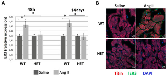 Real-time polymerase chain reaction (PCR) was performed 48 h after Ang II mini-pump implantation (before detectable onset of disease) and after two weeks (full DCM phenotype). Ang II infusion induced IER3 expression in WT animals after 48 h (1.48 ± 0.51-fold, p < 0.05, Figure 2A) and after 14 days (1.55 ± 0.47-fold, p < 0.05, Figure 2A). Interestingly, the cardiac IER3 response was blunted in the HET mice at 48 h (1.07 ± 0.85-fold, n.s.) and two weeks after Ang II infusion (0.93 ± 1.02-fold, n.s.). IER3 expression levels were further assessed by IER3 immunofluorescence staining. In WT mice, Ang II infusion resulted in a slight expression of IER3, mainly in the cardiomyocyte nucleus and the peri-nuclear region, whereas IER3 signals were barely detectable in HET hearts (Figure 2B).