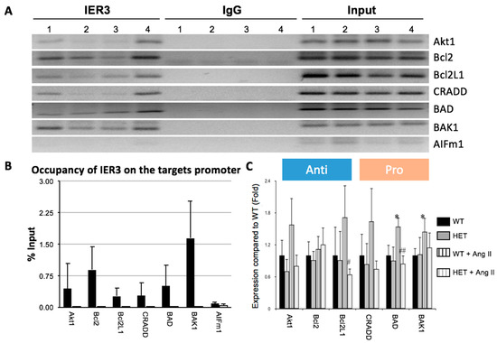 IER3 targets promotor regions of apoptosis genes in the murine heart. (A) Chromatin immunoprecipitation-PCR (ChIP-PCR) analysis of IER3 target promotor regions. IgG ChIP samples were included as negative control. AIFm1 is a non-related negative control. Heart lysates from four different animals (1–4) were analyzed; (B) Percentages of IER3 occupation on its targets promoter regions. Percentage were calculated as the ratio of occupation of ChIP products to input (p < 0.05 for target promotor sites compared to control); (C) Real-time PCR analysis of IER3 target genes in mouse hearts infused with Ang II for two weeks. The expression of BAD and BAK1 was significantly upregulated in the WT mice with Ang II infusion when compared to the WT with saline infusion, the expression of Bcl2L1 and BAD in the HET mice with Ang II infusion was significantly reduced when compared to the WT mice with Ang II infusion (n = 4 for each group, * p < 0.05 compared to the wildtype mice infused with saline. # p < 0.05, ## p < 0.01 compared to wildtype mice infused with Ang II).