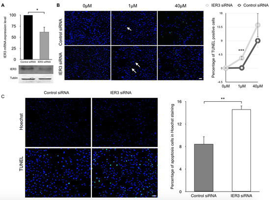 To confirm the role of IER3 in HL-1 cardiomyocytes, we used a heat shock protocol to induce apoptosis. Twenty-four hours after siRNA transfections, cell culture dishes were placed in a humid box to prevent evaporation of the medium and the box was incubated at 45 °C for an hour.