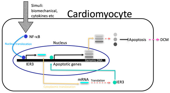 Illustration of the possible role of IER3 in the regulation of cardiac apoptosis and dilated cardiomyopathy (DCM) development. Various stimuli activate NF-κB nucleus translocation (blue curved line). In turn, binding of NF-κB on the promoter of IER3 positively regulates IER3 transcription (black arrow turned right). After pre-mRNA processing, the IER3 mature mRNAs are exported from the nucleus to the cytoplasm (yellow arrow turned right), where they are translated into IER3 proteins (red dashed arrow). Then, IER3 proteins translocate into the cell nuclei (green arrow turned left and up), which binds to the promoter of apoptotic genes and regulates their transcription (black arrow turned right). After pre-mRNA processing, the mRNA of apoptotic genes is exported to the cytoplasm (yellow arrow turned right), and translated to proteins (red dashed arrow). The apoptotic proteins play an anti-apoptotic role in cardiomyocytes (black blunt-end line). Cardiac apoptosis is involved in the development of dilated cardiomyopathy (pink dashed arrow).