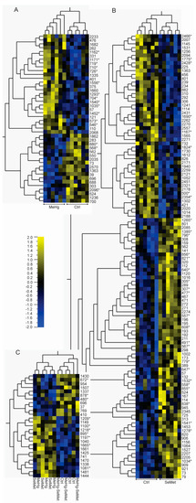 Heatmaps of significantly regulated (p < 0.05, 2-way ANOVA) proteins in the brain of zebrafish (Danio rerio). Zebrafish were fed control, methylmercury (10 µg Hg/g; MeHg), selenomethionine (5 µg Se/g; SeMet), or MeHg and SeMet (10 µg Hg/g + 5 µg Se/g) supplemented diets. After eight weeks of exposure, the brains (n = 12) were sampled and subjected to quantitative intact proteomics analysis. Differential analysis (2-way ANOVA) and hierarchical clustering (Pearson correlation) were performed using the Qlucore omics-explorer. (A,B) depict significantly differentially expressed proteins after exposure to MeHg and SeMet, respectively (p < 0.05, 2-way ANOVA); (C) Depicts the proteins displaying significant MeHg-SeMet interaction effects. The numbers in plots describe the unique difference in gel protein spot identifiers. Protein spots successfully identified by LC-MS/MS are denoted with an asterisk (*). See Table S1 for further details on individual proteins.