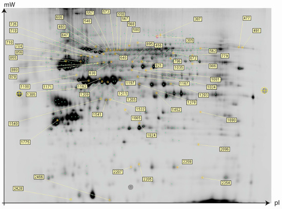 Using Difference gel electrophoresis (DIGE) as previously described [24] followed by factorial ANOVA as implemented in the Qlucore Omics Explorer (version 2.3, Qlucore, Lund, Sweden), we detected 44 (26 up/18 down) and 116 (68 up/48 down) significant (p < 0.05) changes in the abundance of proteins in the brain of zebrafish fed the MeHg and SeMet diet, respectively (Figure 1A,B). In addition, we found 27 proteins, which displayed significant (p < 0.05) SeMet-MeHg interaction effects (Figure 1C). Focusing on the top ranked proteins reproduced successfully on preparative two-dimensional (2D) gels (Figure 2), a total of 64 protein spots were identified by liquid chromatography tandem mass spectrometry (LC-MS/MS). Relevant protein expression data including protein spot identifiers, statistical significance, fold changes, and protein identification features including accession numbers, protein names, isoelectric point, molecular weight, as well protein identification metrics are provided in Table S1.