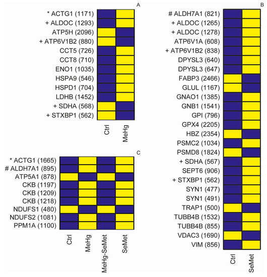 Heatmaps of significantly regulated (p < 0.05, 2-way ANOVA) proteins in the brain of zebrafish (Danio rerio). Significant protein responses elicited by: MeHg (A), SeMet (B) and MeHg-SeMet (C) interactions. The number in brackets following the Ingenuity Pathway Analysis (IPA) mapped identifier represent the gel master spot number provided in Figure 2 and Table S1, respectively. Individual proteins found to be regulated in response to (A,B) are labeled with a plus sign (+). Overlapping responses in (A,C) or (B,C) are marked with an asterisk (*) and a hash (#) sign, respectively. Yellow and blue boxes indicate increased and decreased expression levels relative to the treatment groups; the respective log2 fold changes are listed in Table S1.