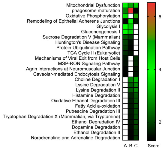Canonical pathway analysis. Significantly regulated (p < 0.05, 2-way ANOVA) proteins in the brain of zebrafish (Danio rerio) after exposure to: MeHg (A), Se (B) and MeHg-SeMet (C). Interactions were subjected to IPA. Statistical significance of the overrepresentation of proteins in different “canonical pathways” is shown as a heatmap. Only selected pathways that were significantly (p < 0.05, Fisher’s exact test) enriched in at least one of the exposure conditions are shown alongside their significance values expressed as scores (−log10 p-value). Scores above the cut-off (1,3) are displayed by a color gradient. Scores below the cut-off value are displayed as white boxes. The full data-set including the proteins in each pathway is presented in Table S2B.