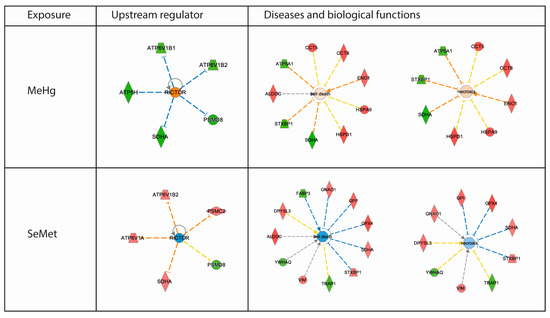 Ingenuity Pathway Analysis (IPA) of “upstream regulators” and “diseases and biological functions” of the lists of significantly regulated proteins (p < 0.05, 2-way ANOVA). RICTOR, the rapamycin-insensitive binding partner of the mammalian target of rapamycin (mTOR) was highlighted as a novel master upstream regulator that was predicted to be activated and inhibited in MeHg and SeMet exposed zebrafish brain, respectively. Diseases and biological functions analysis highlighted “cell death” and “necrosis” to be activated by MeHg and inhibited in SeMet exposed zebrafish brain. Activation (displayed in yellow) and inhibition (displayed in blue) of regulators and functions are based on IPA activation z-scores, which combine directional information encoded in the protein expression results with knowledge from the literature to make predictions about likely adverse outcome pathways. Up-regulated proteins are coloured red, down-regulated proteins are coloured green. The full data-sets of the upstream regulator analysis and the diseases and biological functions are presented in Table S2C,D.