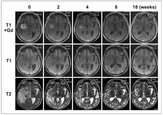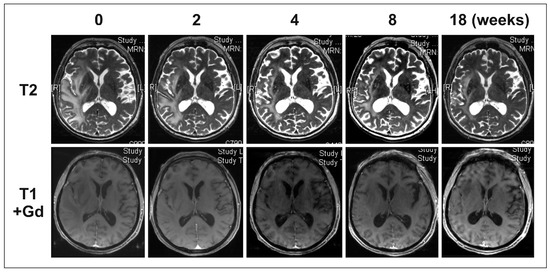 Exemplary magnetic resonance imaging (MRI) of Patient 7: non-contrast enhancing lesion. T2 sequences and T1 sequences after intravenous gadolinium administration were obtained at Weeks 0, 2, 4, 8 and 18 after BEV therapy initiation. While throughout the observation period no contrast enhancement was observed on this level, the T2 sequences from Week 18 show non-enhancing progressive disease.