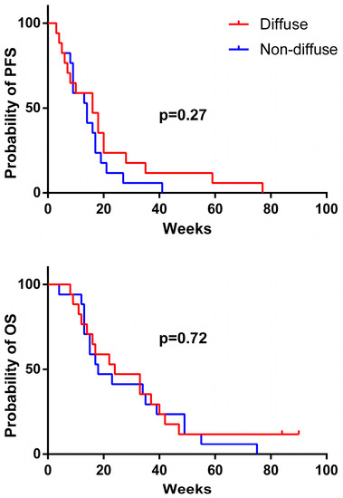 Progression-free (PFS) and overall survival (OS). No significant difference in PFS and OS from patients with a gliomatosis cerebri growth pattern (diffuse) compared to patients with a predominantly solid tumor phenotype (non-diffuse) was observed.