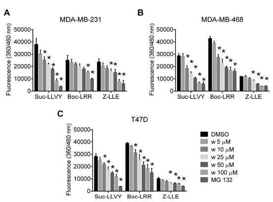 Wedelolactone inhibits chymotrypsin-like, trypsin-like and caspase-like activities in breast cancer cells. MDA-MB-231 (A); MDA-MB-468 (B); and T47D (C) cells were treated with various concentrations of wedelolactone (w) for 10 h. Proteasome activities were evaluated in cell extracts using the activity-specific fluorogenic substrates (Suc-LLVY-AMC for testing chymotrypsin-like, Z-LLE-AMC for caspase-like, and Boc-LRR-AMC for trypsin-like activities). Treatment with MG132 served as a positive control. The data represent the mean values from three independent experiments. Error bars indicate the SD. * indicates a significant (p < 0.05) difference between wedelolactone-/MG132- and DMSO-treated cells.