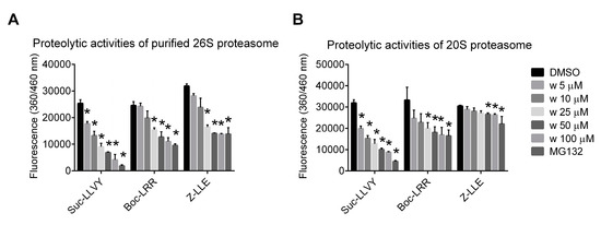 The 26S proteasome purified from MDA-MB-231 cells and the commercially available 20S proteasome were incubated separately with the activity-specific fluorogenic substrates and wedelolactone in various concentrations to evaluate the ability of wedelolactone to inhibit their chymotrypsin-like, trypsin-like, and caspase-like activities. Wedelolactone inhibited all three proteasomal activities in vitro in a dose-dependent manner with the highest potency against the chymotrypsin-like activity (IC50 values 9.97 μM for 26S and 6.13 μM for 20S proteasome) (Figure 2).