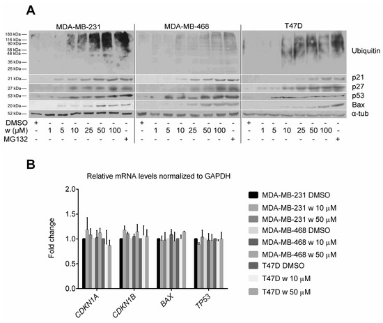 Multiubiquitinated and high turnover proteins accumulate in wedelolactone-treated breast cancer cells. MDA-MB-231, MDA-MB-468, and T47D cells were treated with various concentrations of wedelolactone or solvent for 10 h. (A) Protein extracts were subsequently analyzed by SDS-PAGE and immunoblotting using p21-, p27-, p53-, Bax-, and ubiquitin-specific antibodies. Treatment with MG132 served as a positive control; (B) Transcripts of CDKN1A, CDKN1B, TP53 and BAX genes were quantified using qPCR.