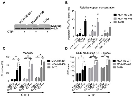 Copper loading enhances cytotoxicity and ROS production in wedelolactone-treated breast cancer cells. MDA-MB-231, MDA-MB-468, and T47D cells were transiently transfected with pCNDA3.1-hCTR1-N-Myc (CTR1) or control pCDNA3.1 plasmids (cmv), pretreated with copper sulfate (Cu) for 24 h and subsequently treated with wedelolactone (w) or solvent (DMSO) in fresh media. (A) Cells were harvested and expression of exogenous CTR1 protein was confirmed by SDS-PAGE followed by immunoblotting with the Myc-Tag antibody; (B) Relative copper concentration in cell lysates was analyzed by SALD ICP MS. Data for copper are presented as an integrated 63Cu/60Ni signal ratio. (C) Cell mortality and (D) ROS production were evaluated after PI/DHE staining using flow-cytometry. The data represent the mean values from three independent experiments. Error bars indicate the SD. * indicates a significant (p < 0.05) difference.
