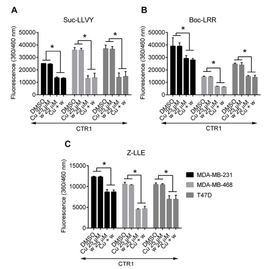 MDA-MB-231, MDA-MB-468, and T47D cells (6 × 105) were seeded in 5 mL of culture media. Next day, transient transfection was performed, using 4 μL of Lipofectamine LTX reagent (Invitrogen, Carlsbad, CA, USA) with a mixture containing 2 μg of pCDNA3.1-hCTR1-N-Myc or control pCDNA3.1 plasmid and 2 μL of PLUS reagent (Invitrogen). Six hours later, the medium was replaced, cells were treated with 25 μM copper sulfate or left untreated for 24 h, and then were exposed to wedelolactone or DMSO for 10 h in fresh media. Cells were then harvested and proteasome activity was analyzed as described in 4.3.3.