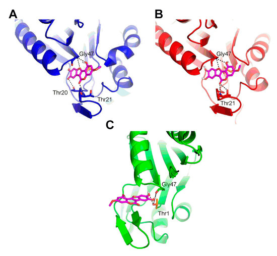 The focused docking identified similar binding mode of wedelolactone in the β1 and β2 subunits. Aside from the hydrophobic contacts, wedelolactone formed specific H-bond with the backbone of Thr21 and Gly47 in both subunits. Moreover, wedelolactone formed an additional H-bond with the side-chain of Thr20 in the β1 subunit. Wedelolactone sterically blocked the catalytic residue Thr1 in both β1 and β2 subunits, possibly modulating its proteolytic activity (Figure 6A,B). The focused docking identified a different binding mode of wedelolactone in the β5 subunit. Aside from the specific H-bond with the backbone of Gly47, two hydroxyl groups of wedelolactone were able to form H-bond with the catalytic residue Thr1 (Figure 6C). This specific interaction might be responsible for the preferred binding to the β5 active site over the β1 and β2 active sites, observed in the blind docking. Beside the steric hindrance, the interaction with the catalytic residue Thr1 might be responsible for the elevated inhibition of chymotrypsin-like activity observed experimentally.