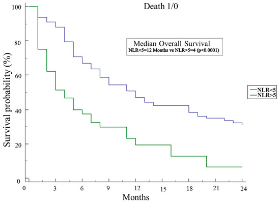 When we evaluated the whole cohort of PDAC patients, the factors significantly associated with worse OS at the multivariate analysis were age, male sex, tumor size, presence of distant metastasis and, among the above mentioned scores, an NLR > 5, while the access to any chemotherapy was associated with better OS (see Table 2). Patients with an NLR < 5 had a median OS of 12 months compared to 4 months in those with an NLR > 5 (see Figure 1).